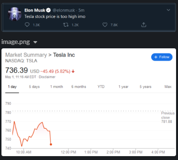This is so bizarre. Tesla stock price is too high imo. Teslas stock was trading around 761 per share when the too high tweet was sent out.